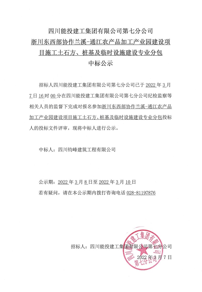 浙川东西部协作兰溪-通江农产品加工产业园建设项目施工土石方、桩基及临时设施建设专业分包中标公示
