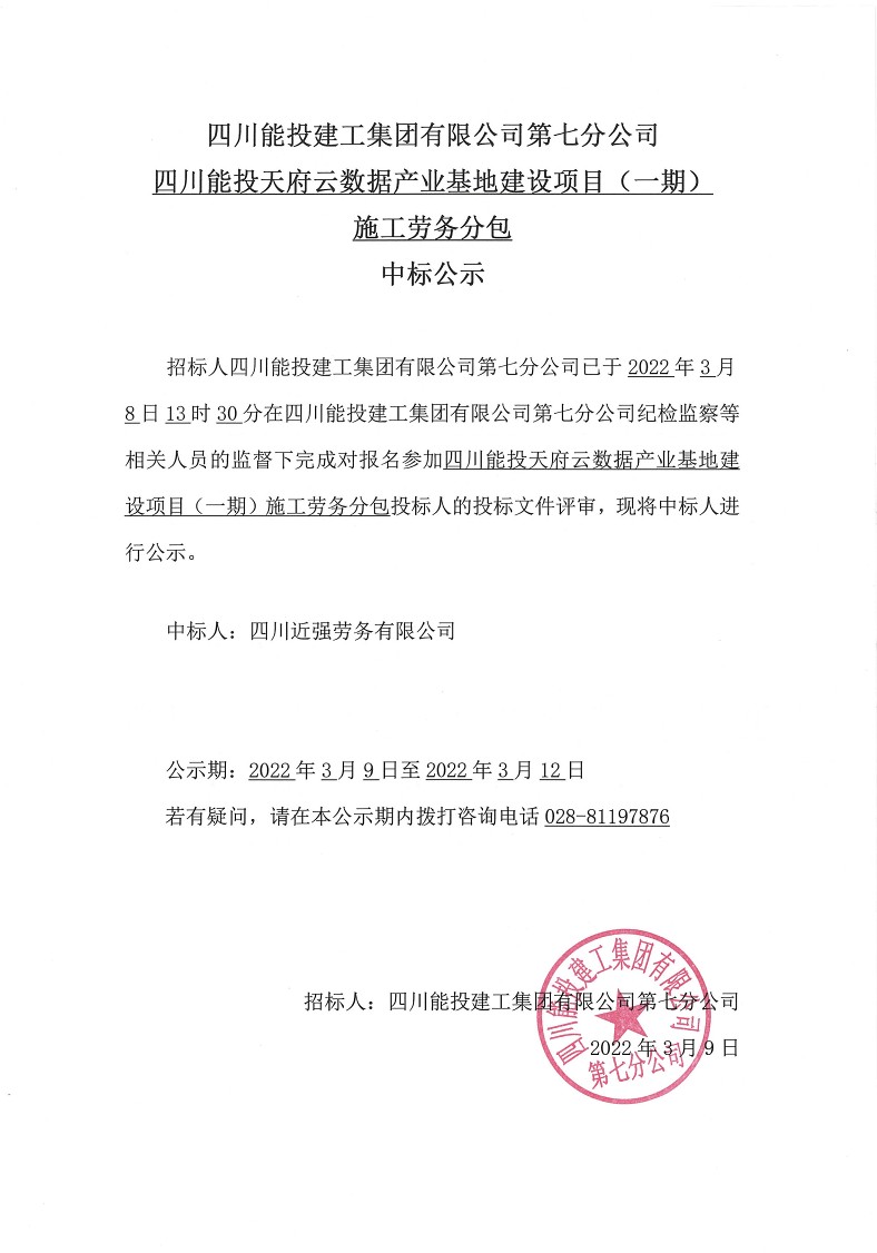 四川能投天府云数据产业基地建设项目(一期)施工劳务分包中标公示