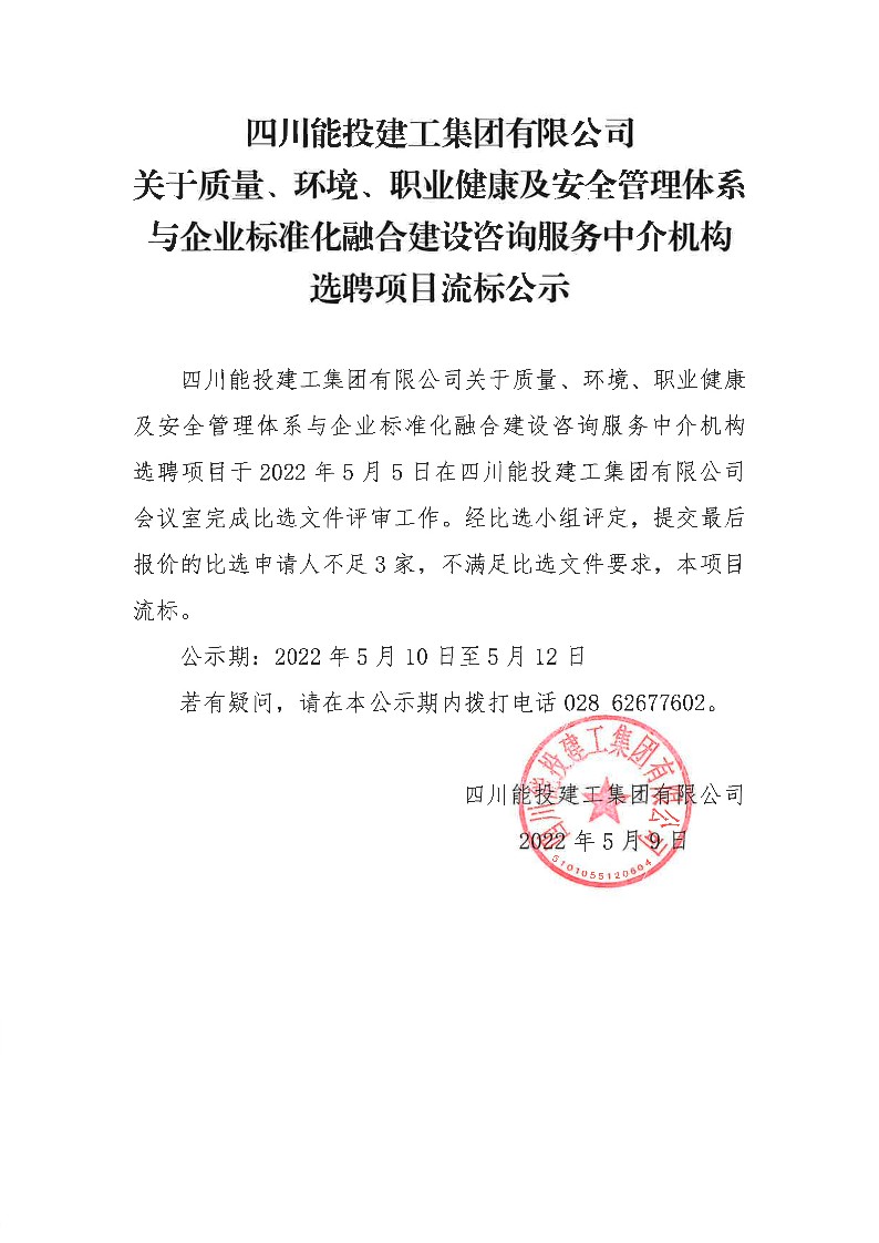 关于质量、环境、职业健康及安全管理体系与企业标准化融合建设咨询服务中介机构选聘项目流标公示