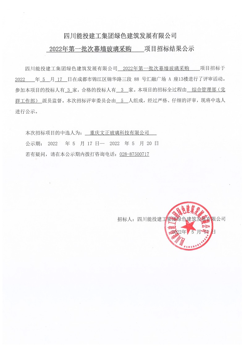 2022年第一批次幕墙玻璃采购项目招标结果公示