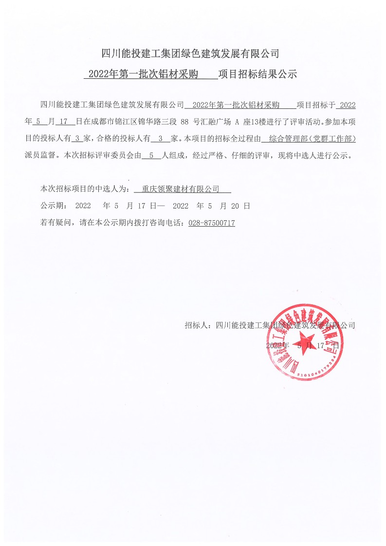 2022年第一批次幕墙玻璃采购项目招标结果公示