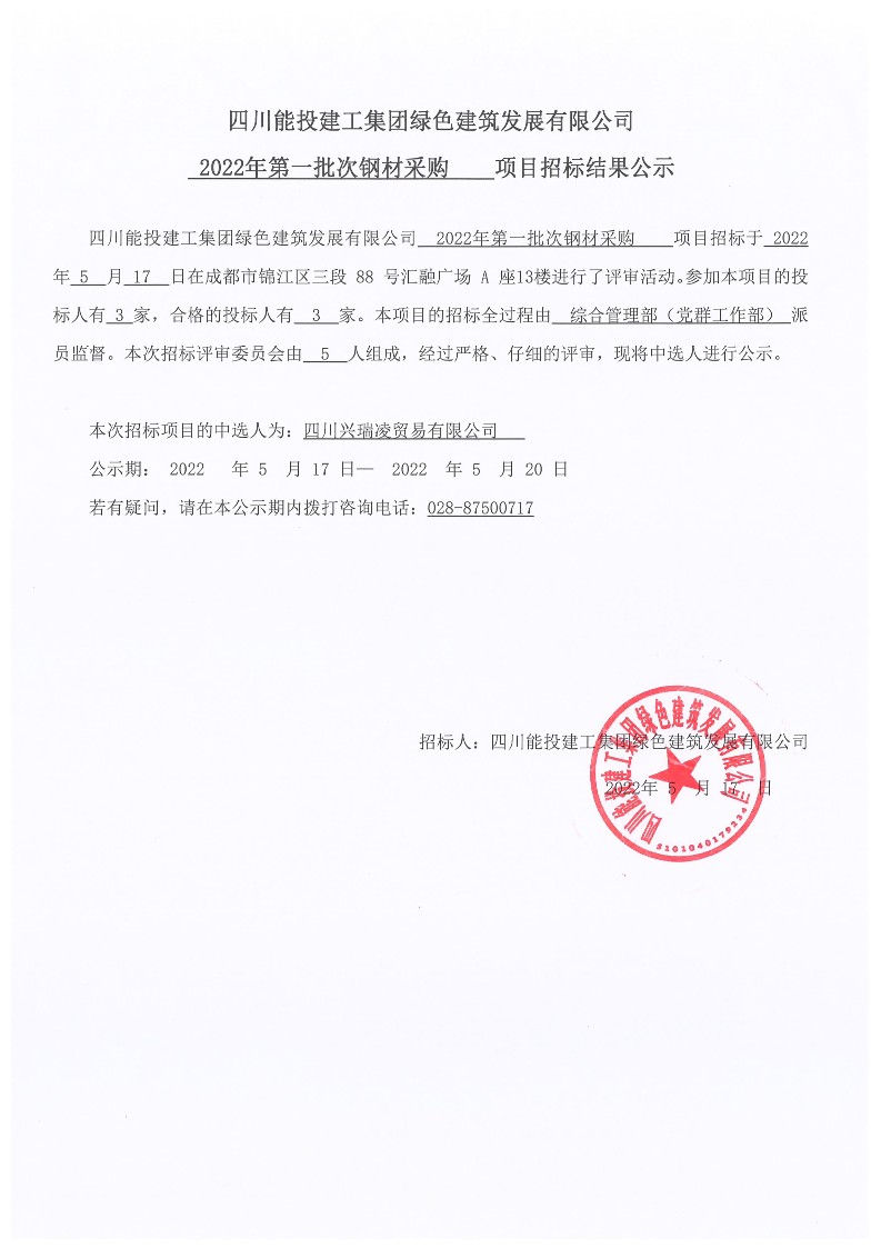 2022年第一批次钢材采购项目招标结果公示