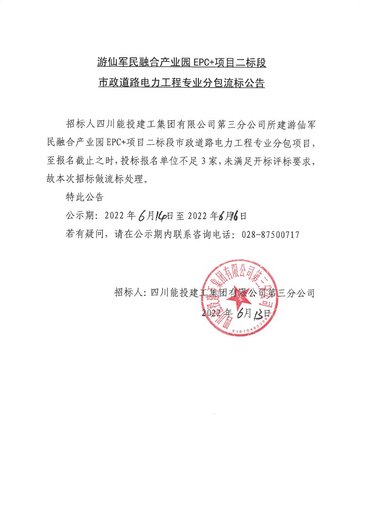游仙军民融合产业园EPC+项目二标段市政道路电力工程专业分包流标公告