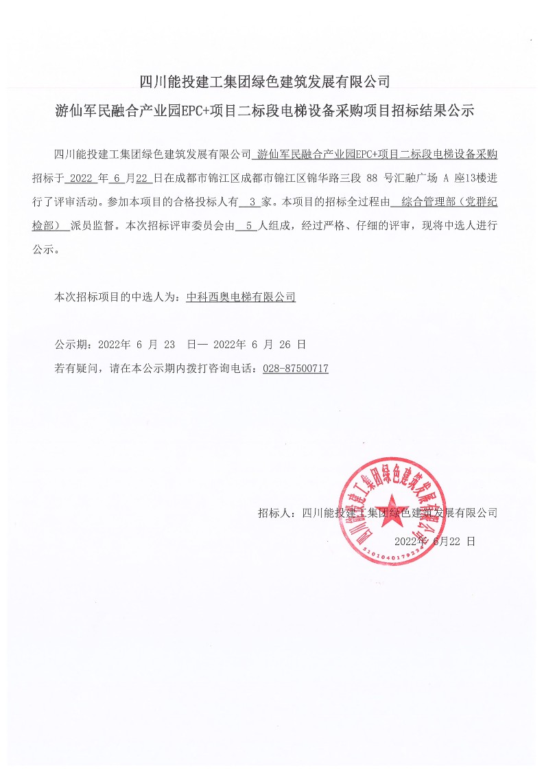 游仙军民融合产业园EPC+项目二标段电梯设备采购项目招标结果公示