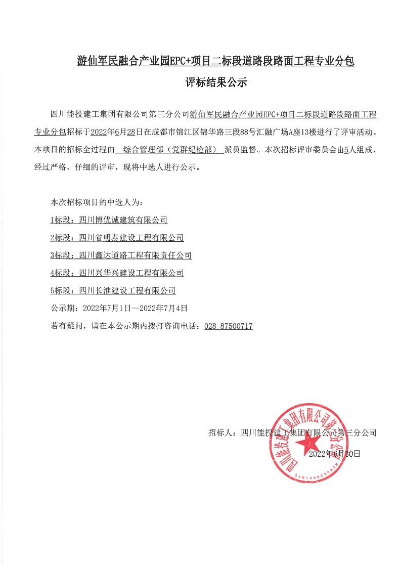 游仙军民融合产业园EPC+项目二标段道路段路面工程专业分包结果公示