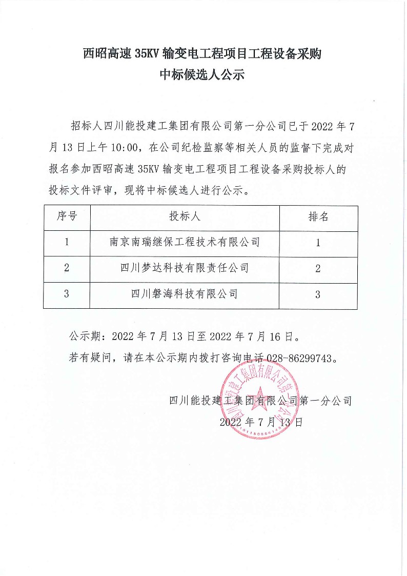 西昭高速35KV输变电工程项目工程设备采购中标候选人公示
