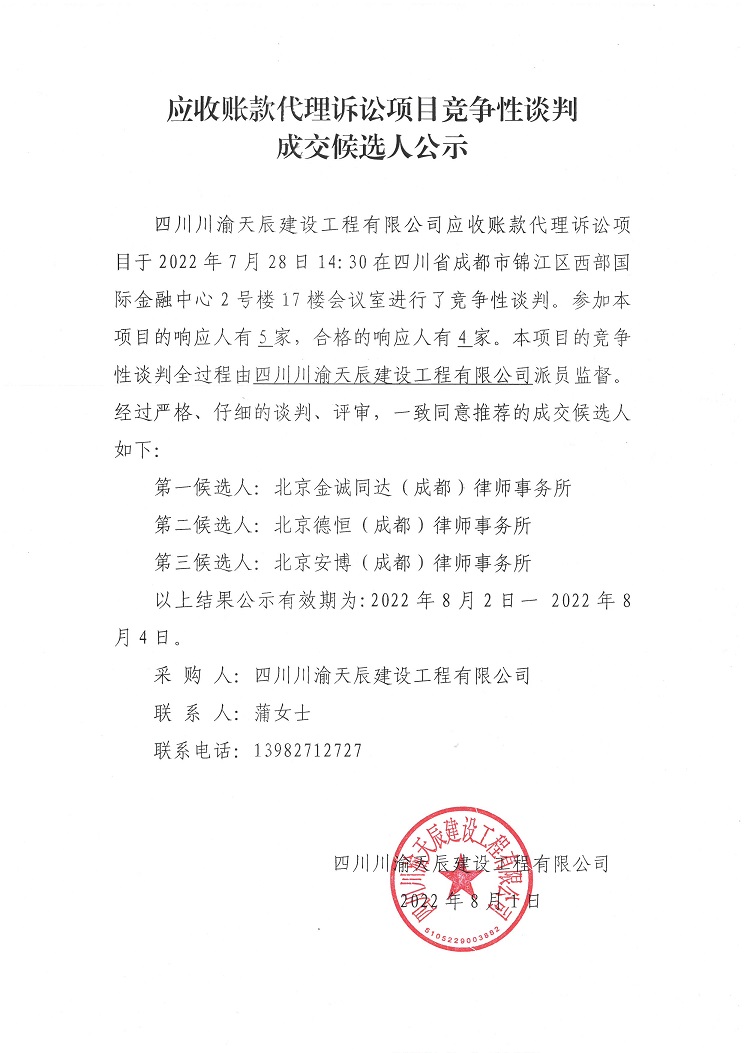 应收账款代理诉讼项目竞争性谈判成交候选人公示