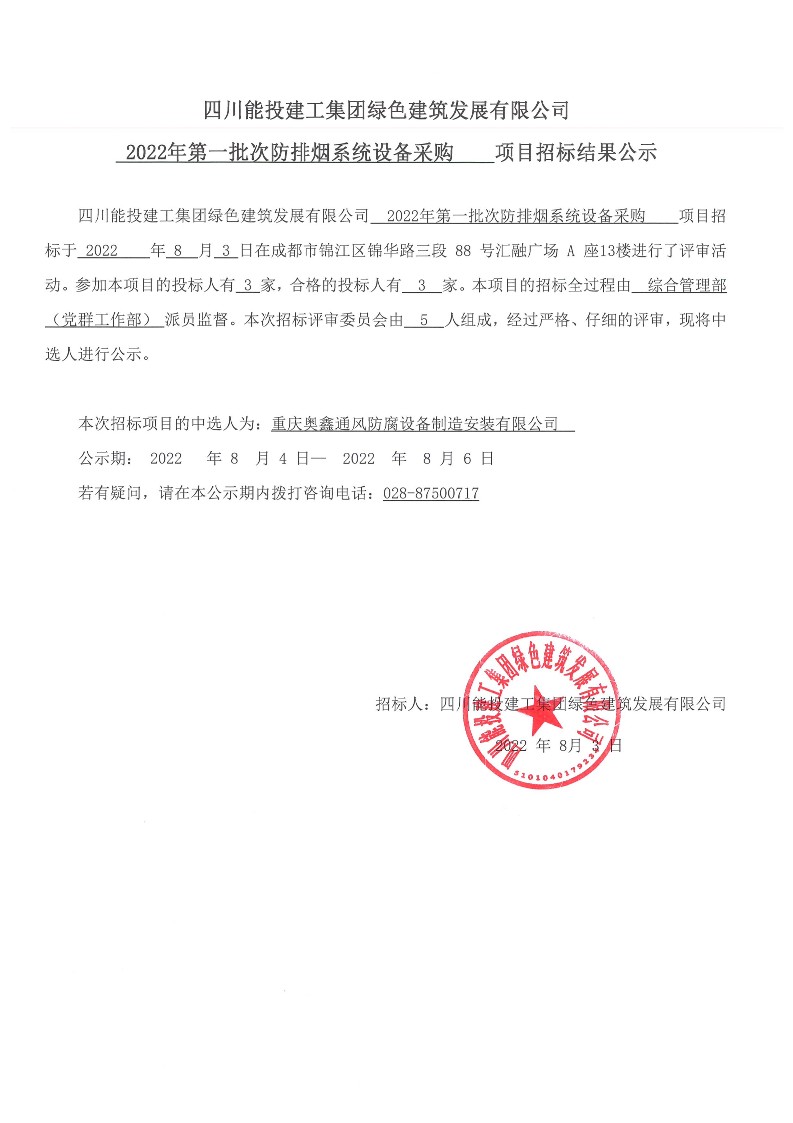 2022年第一批次防排烟系统设备采购项目招标结果公示