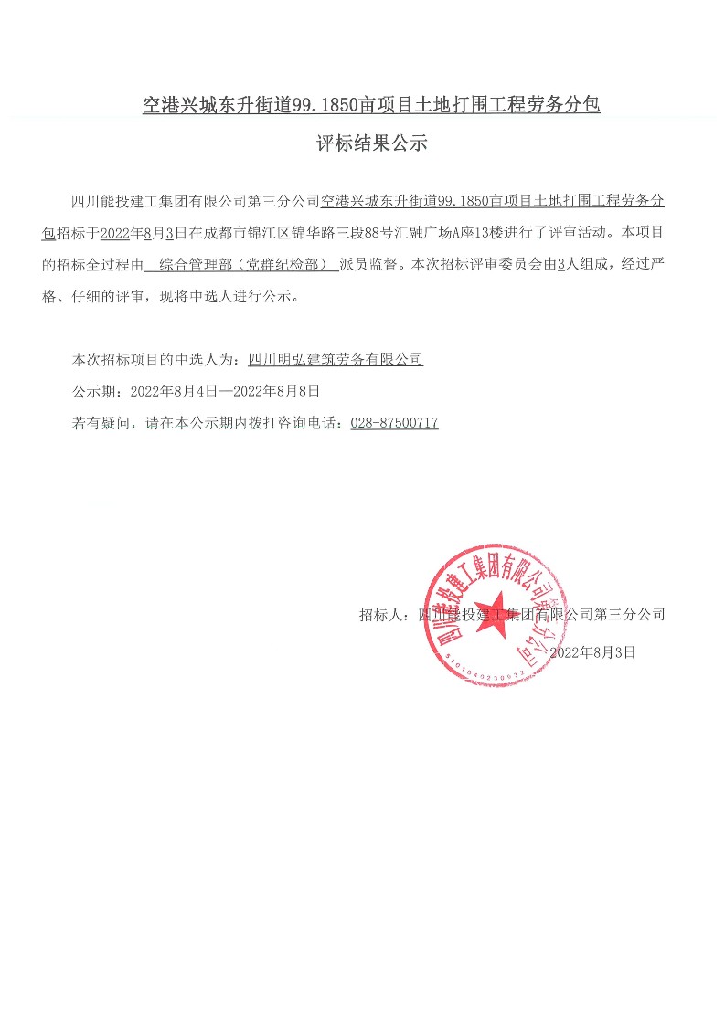 空港兴城东升街道99.1850亩项目土地打围工程劳务分包结果公示