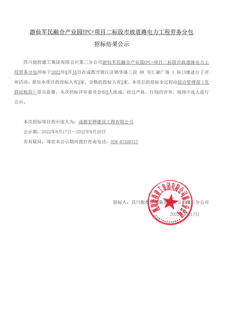 游仙军民融合产业园EPC+项目二标段市政道路电力工程劳务分包结果公示