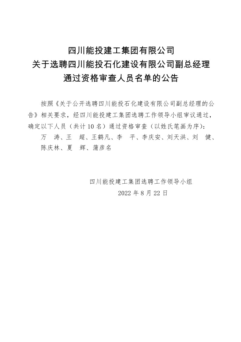 关于选聘四川能投石化建设有限公司副总经理通过资格审查人员名单的公告