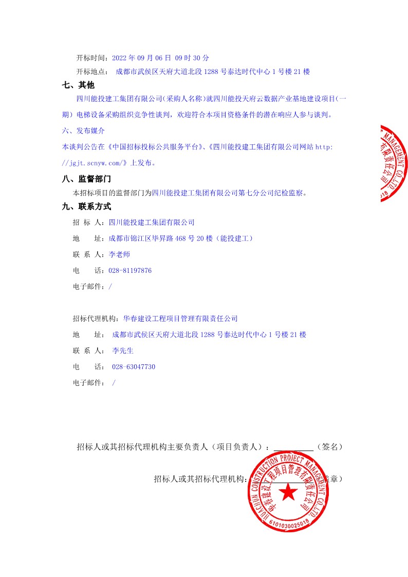 四川能投天府云数据产业基地建设项目(一期)电梯设备采购竞争性谈判公告