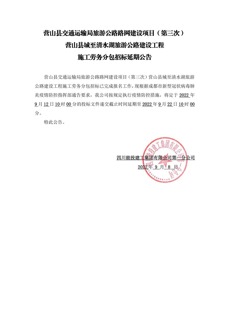营山县城至清水湖旅游公路建设工程施工劳务分包招标延期公告