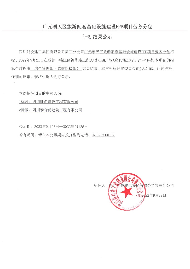 广元朝天区旅游配套基础设施建设PPP项目劳务分包结果公示