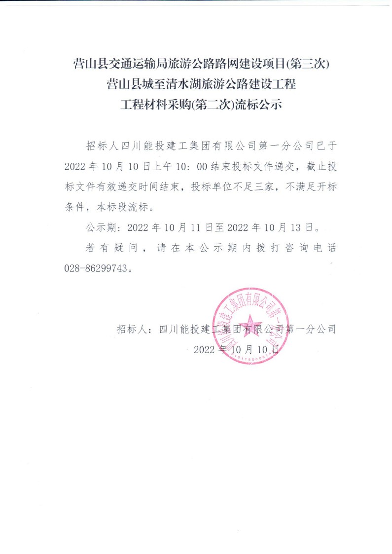 营山县城至清水湖旅游公路建设工程材料采购(第二次)流标公示