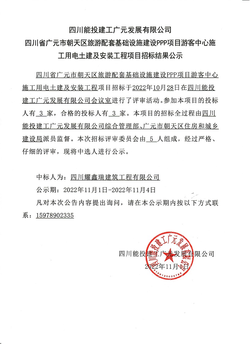 广元市朝天区旅游配套基础设施建设PPP项目游客中心施工用电土建及安装工程项目招标结果公示