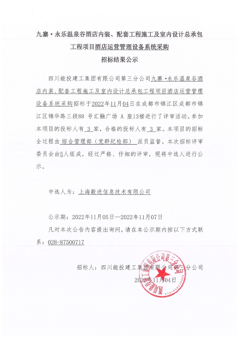 九寨·永乐温泉谷酒店内装、配套工程施工及室内设计总承包工程项目酒店运营管理设备系统采购招标结果公示