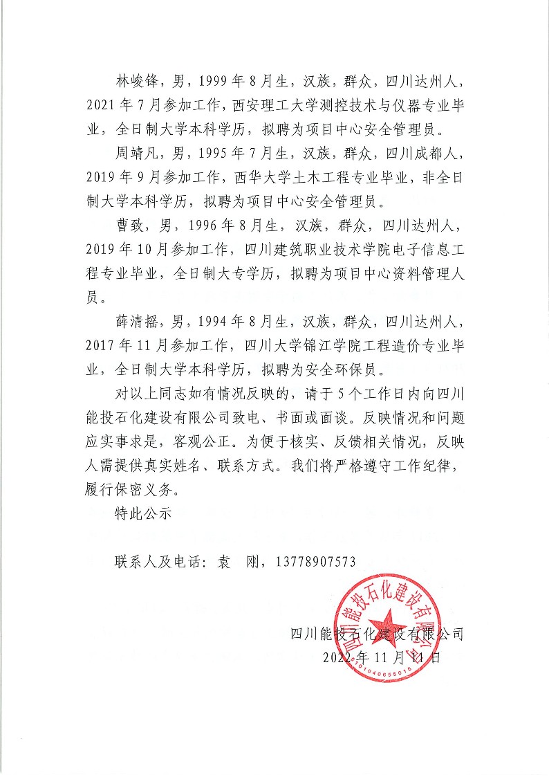 四川能投石化建设有限公司招聘结果公示