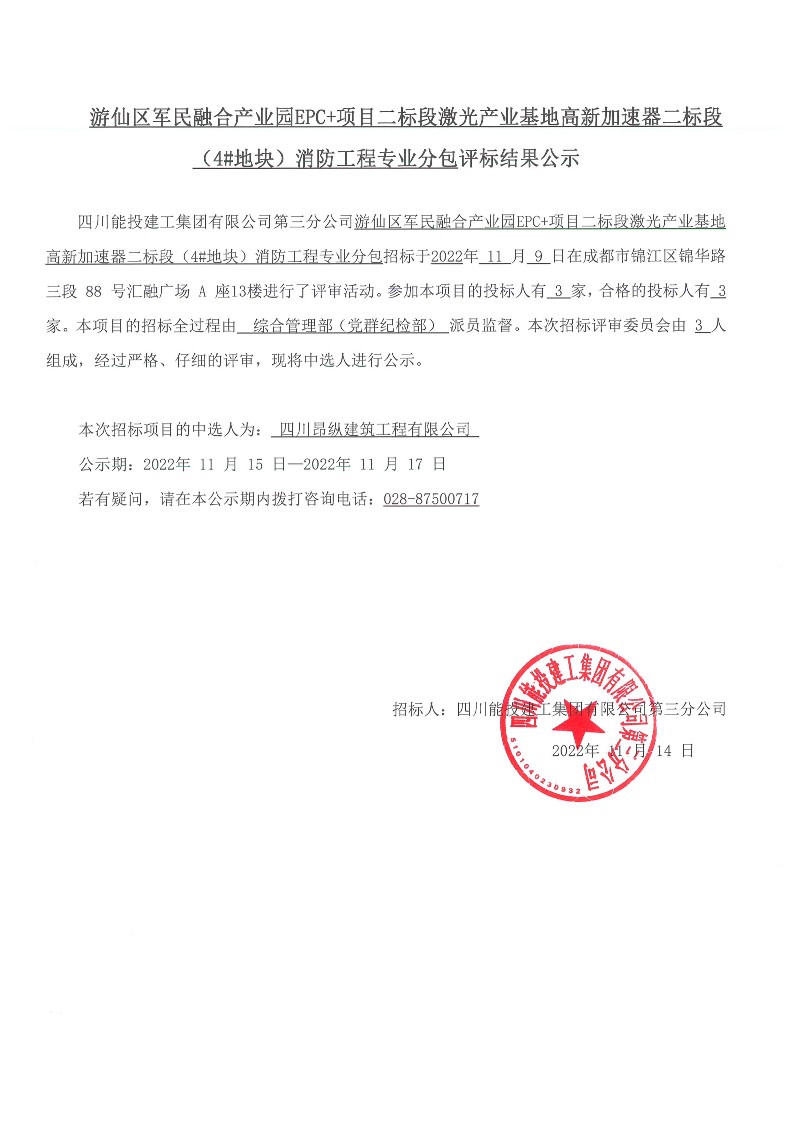 游仙区军民融合产业园EPC+项目二标段激光产业基地高新加速器二标段(4#地块)消防工程专业分包结果公示