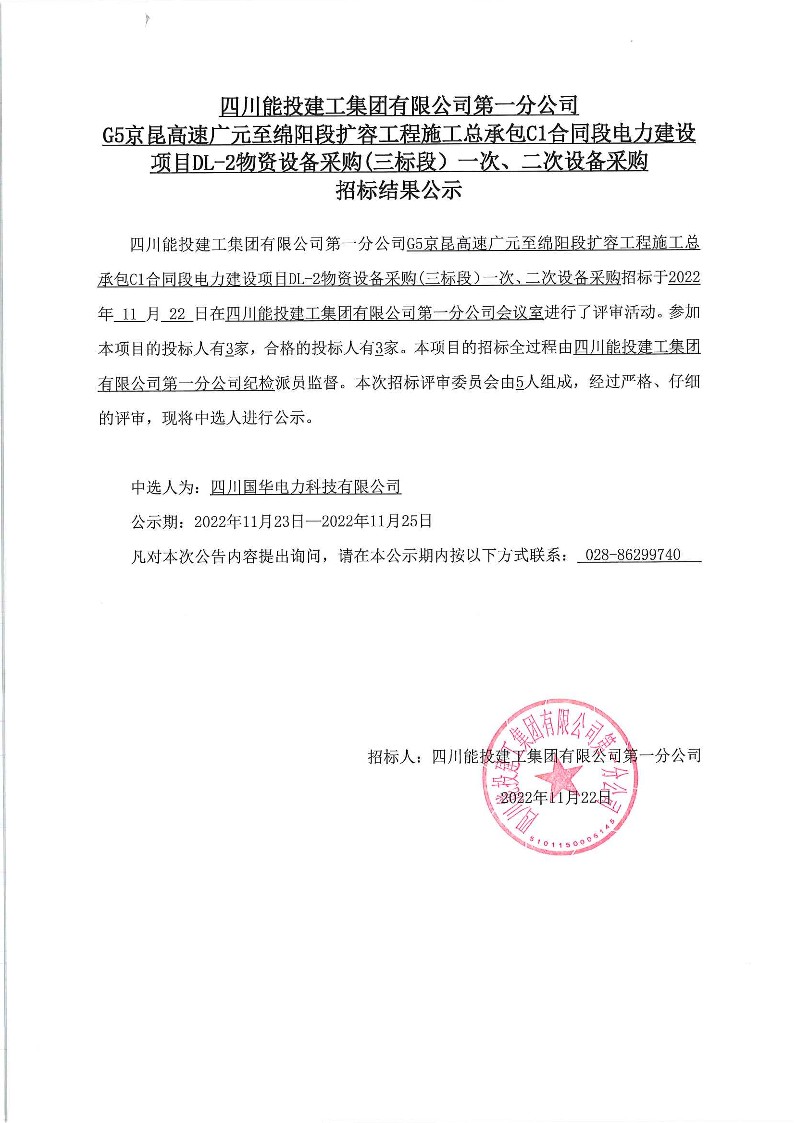 下一条:G5京昆高速广元至绵阳段扩容工程施工总承包C1合同段电力建设项目DL-2物资设备采购(二标段)电杆采购招标结果公示