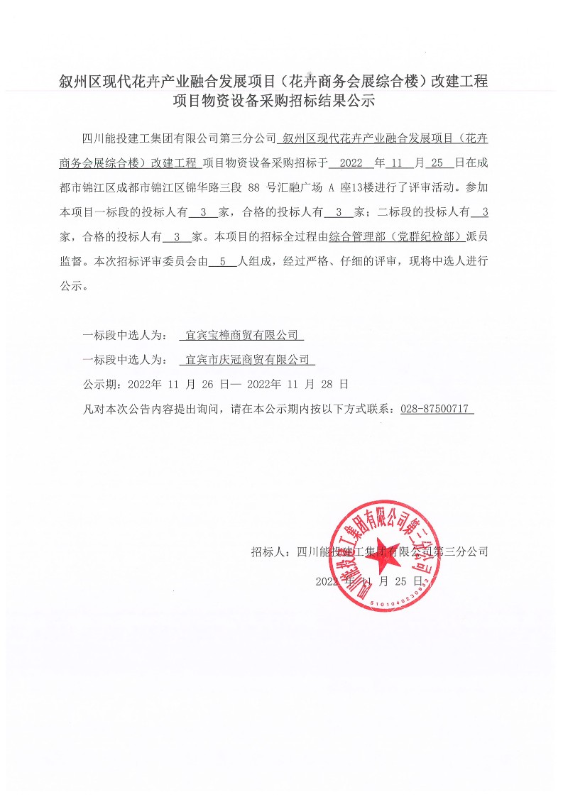 叙州区现代花卉产业融合发展项目(花卉商务会展综合楼)改建工程项目物资设备采购招标结果公示