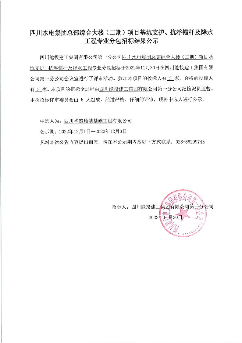 四川水电集团总部综合大楼(二期)项目基坑支护、抗浮锚杆及降水工程专业分包结果公示