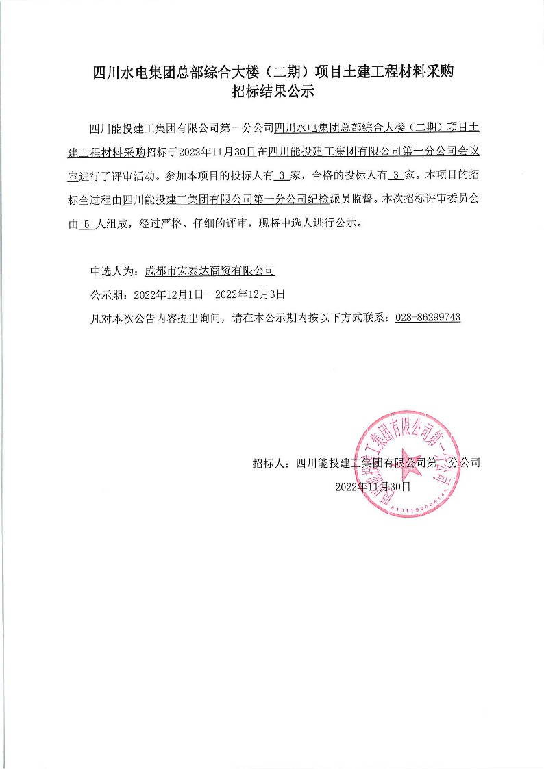 四川水电集团总部综合大楼(二期)项目土建工程材料采购结果公示
