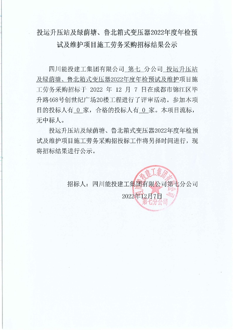 投运升压站及绿荫塘、鲁北箱式变压器2022年度年检预试及维护项目施工劳务分包招标结果公示