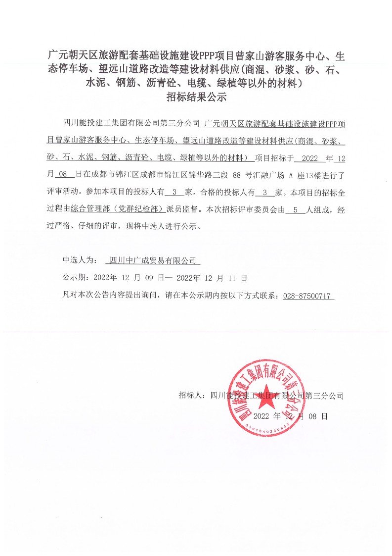 广元朝天区旅游配套基础设施建设PPP项目曾家山游客服务中心、生态停车场、望远山道路改造等建设材料供应招标结果公示