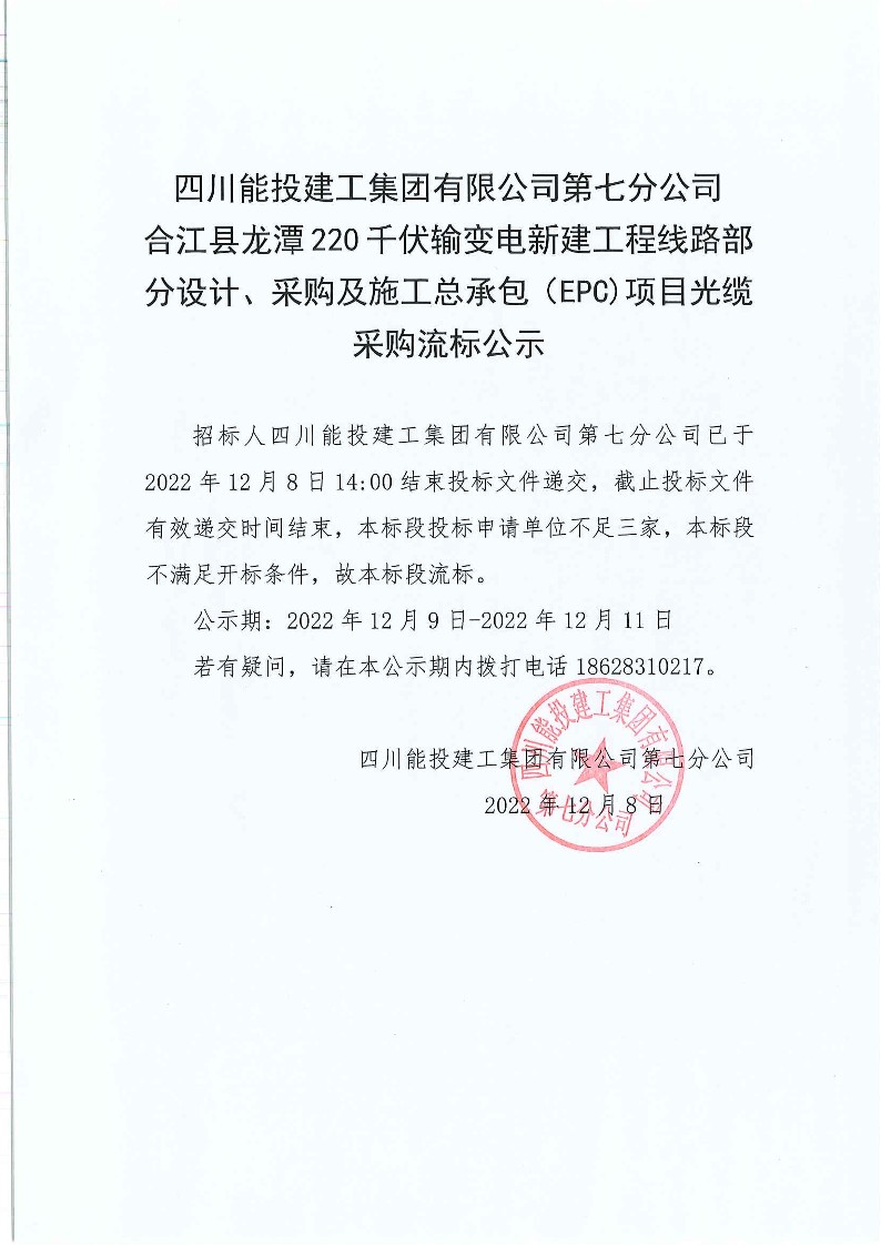 合江县龙潭220千伏输变电新建工程线路部分设计、采购及施工总承包(EPC)项目光缆采购流标公示