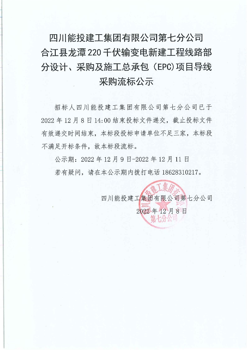 合江县龙潭220千伏输变电新建工程线路部分设计、采购及施工总承包(EPC)项目导线采购流标公示
