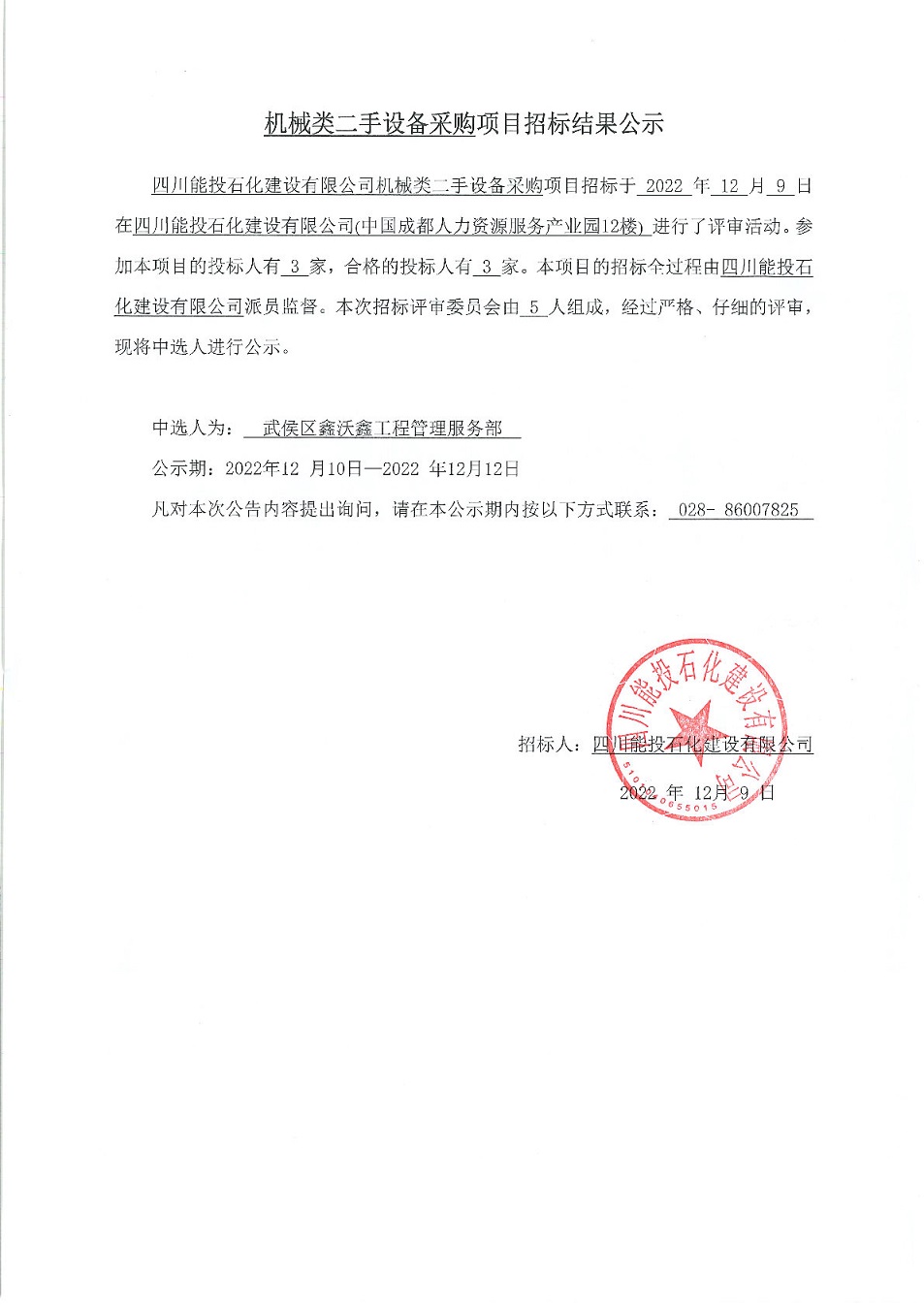 机械类二手设备采购项目招标结果公示