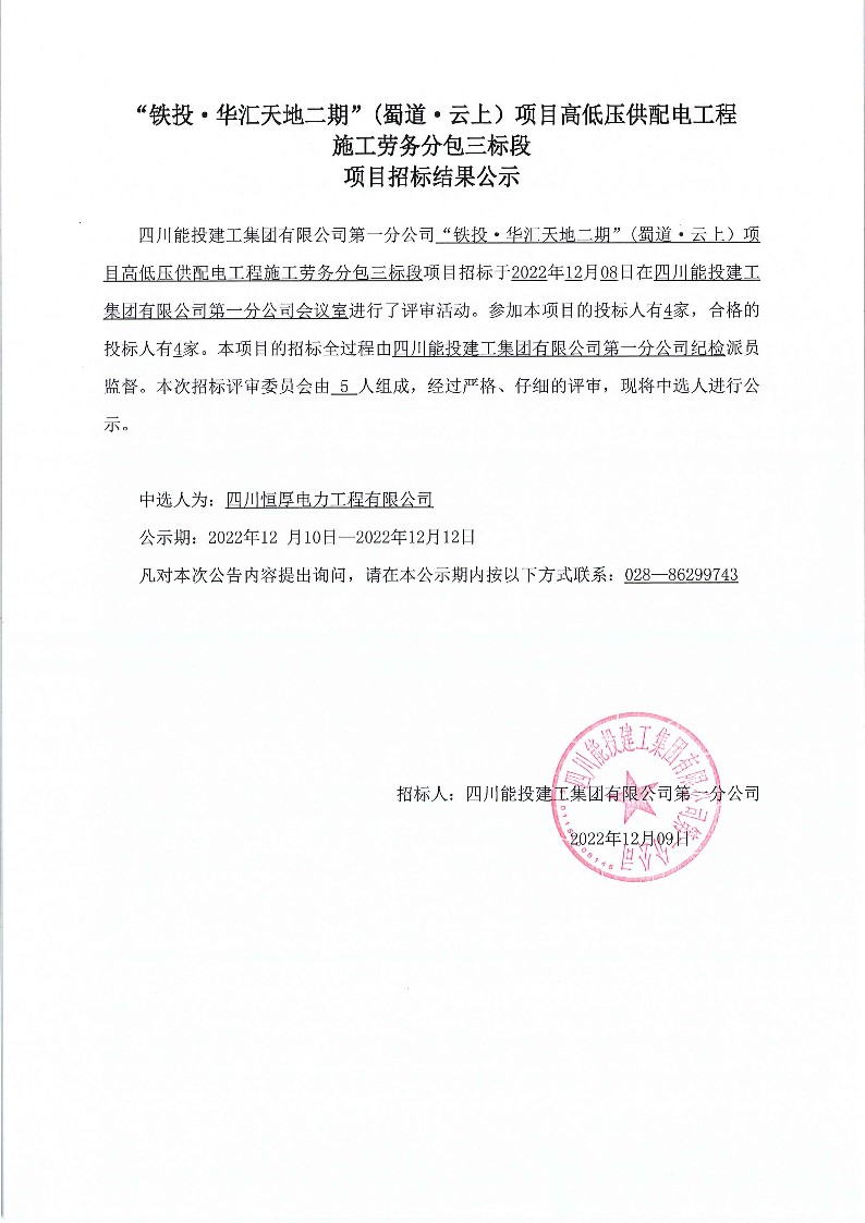 “铁投·华汇天地二期”(蜀道·云上)项目高低压供配电工程施工劳务分包三标段项目招标结果公示