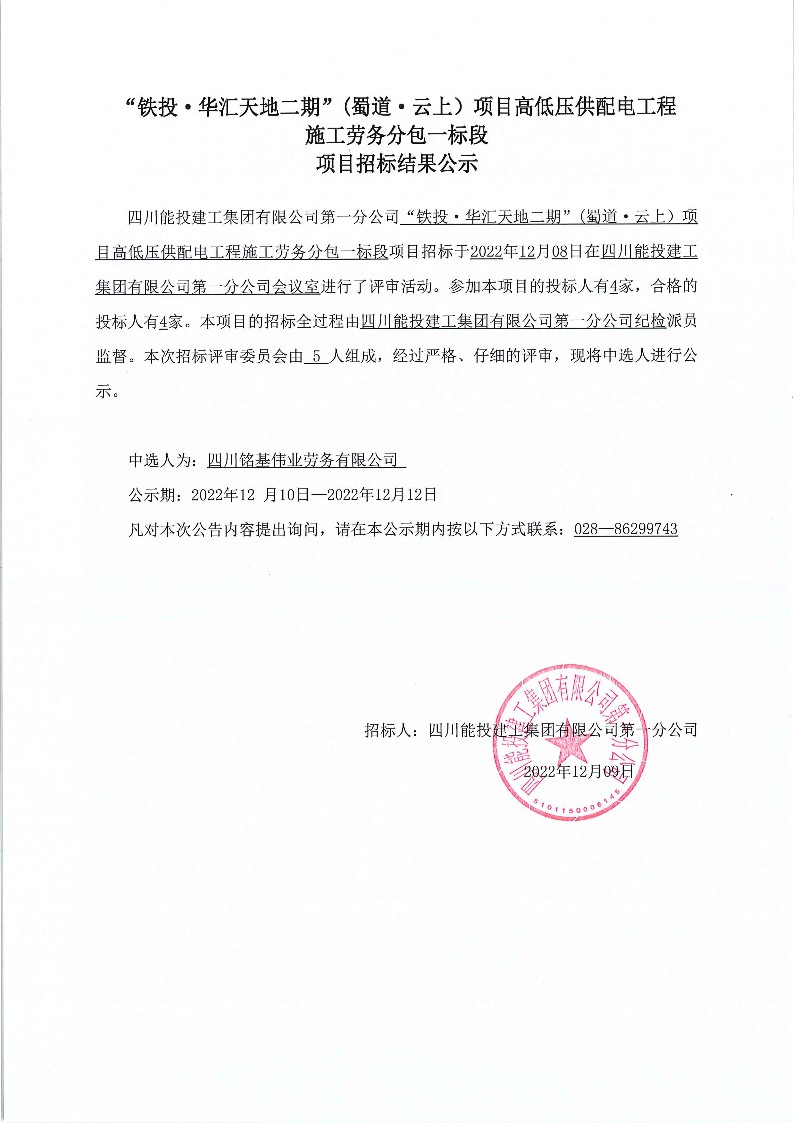 上一条:“铁投·华汇天地二期”(蜀道·云上)项目高低压供配电工程施工劳务分包二标段项目招标结果公示
