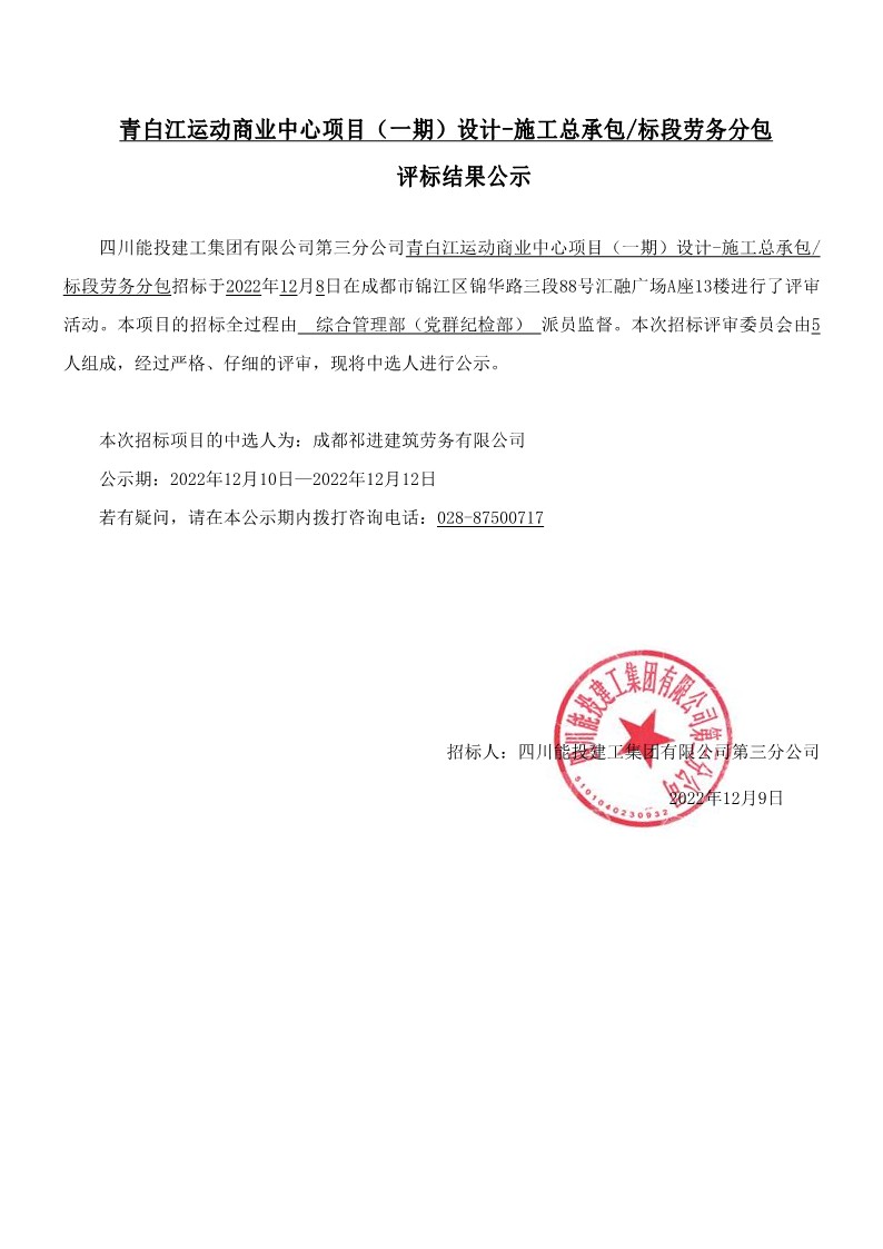 青白江运动商业中心项目(一期)设计-施工总承包劳务分包结果公示