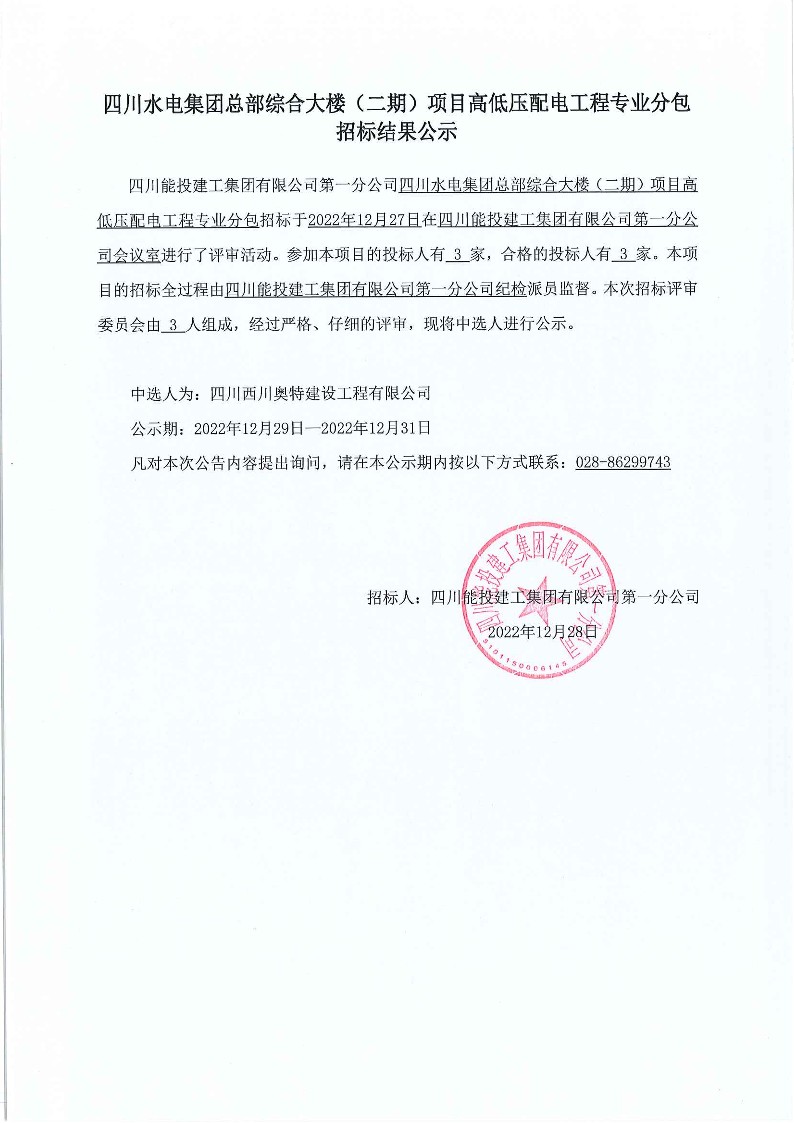四川水电集团总部综合大楼(二期)项目高低压配电工程专业分包招标结果公示