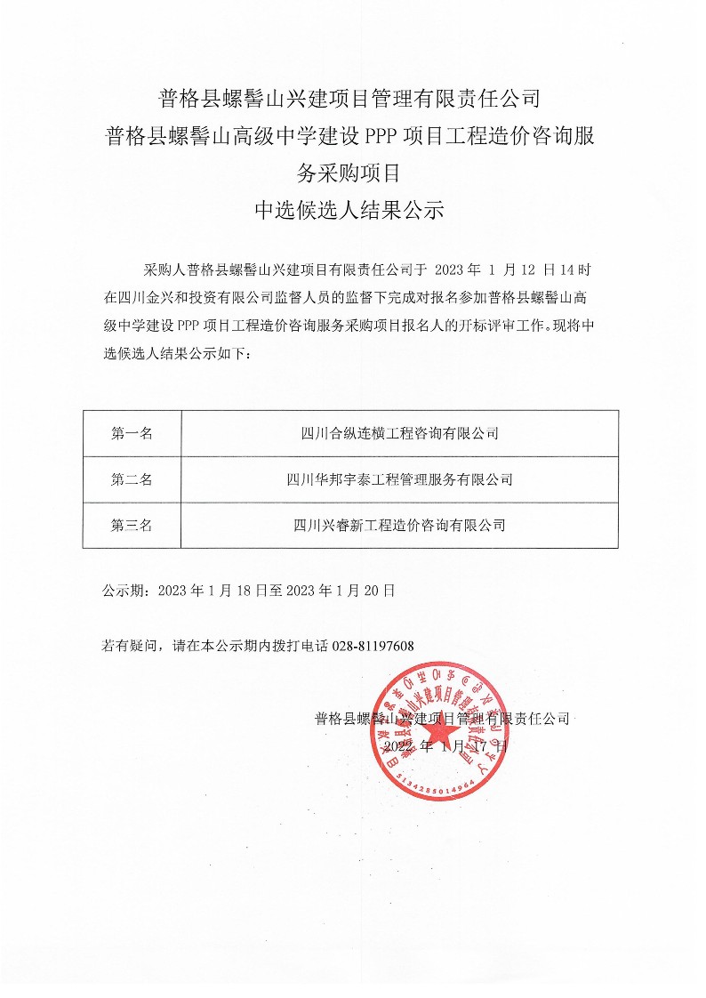 普格县螺髻山高级中学建设PPP项目工程造价咨询服务采购项目中选候选人结果公示