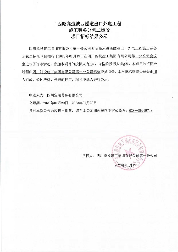 西昭高速波西隧道出口外电工程施工劳务分包一标段结果公示