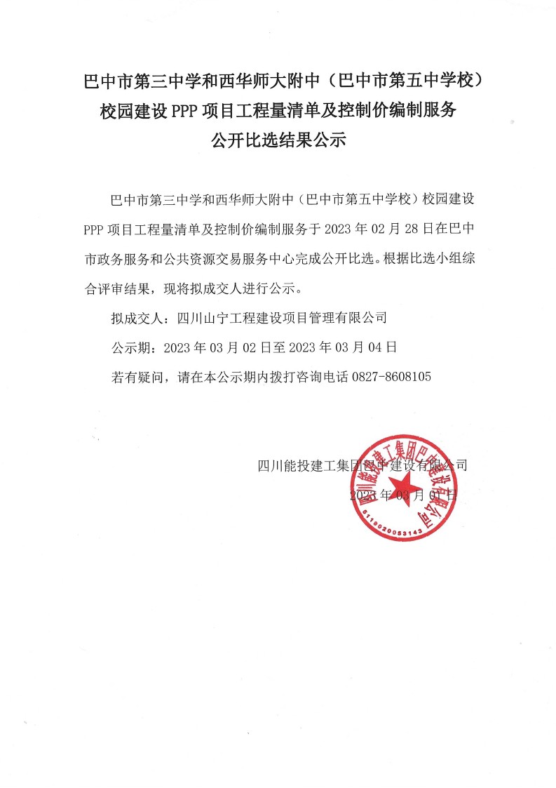 巴中市第三中学和西华师大附中(巴中市第五中学校)校园建设PPP项目工程量清单及控制价编制服务公开比选结果公示
