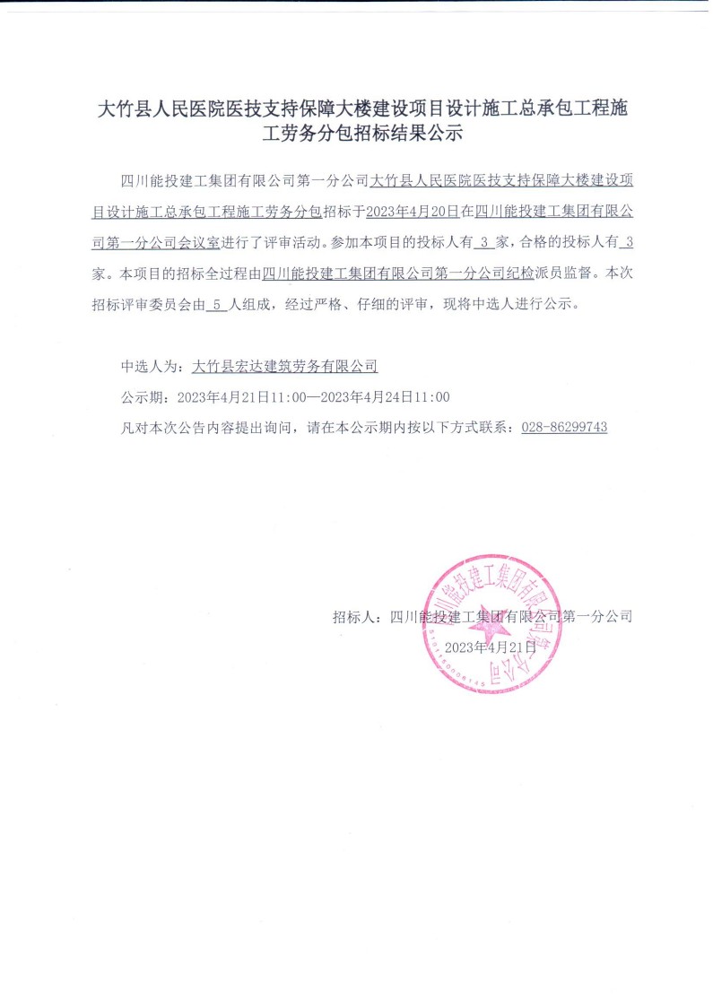 大竹县人民医院医技支持保障大楼建设项目设计施工总承包工程施工劳务分包招标结果公示