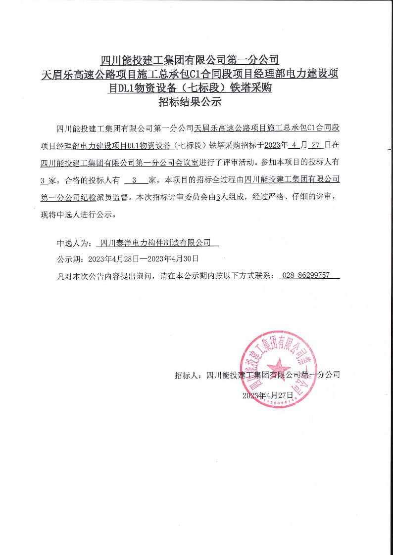 天眉乐高速公路项目施工总承包C1合同段项目经理部电力建设项目DL1物资设备(七标段)铁塔采购招标结果公示