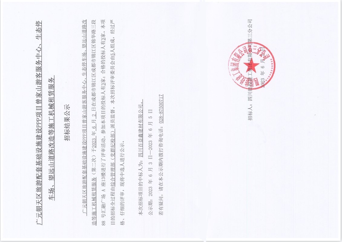 广元朝天区旅游配套基础设施建设PPP项目曾家山游客服务中心、生态停车场、望远山道路改造等施工机械租赁服务结果公示