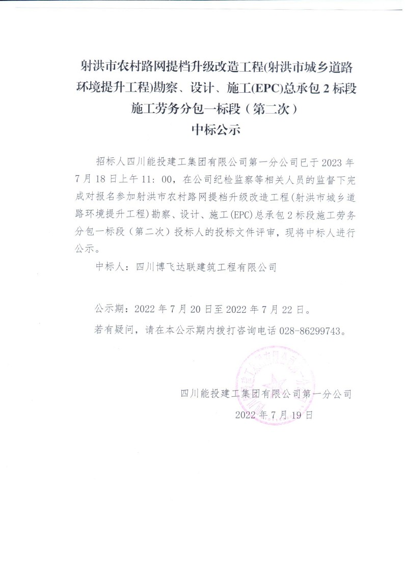 上一条:射洪市农村路网提档升级改造工程(射洪市城乡道路环境提升工程)勘察、设计、施工(EPC)总承包2标段材料采购(第二次)中标公示