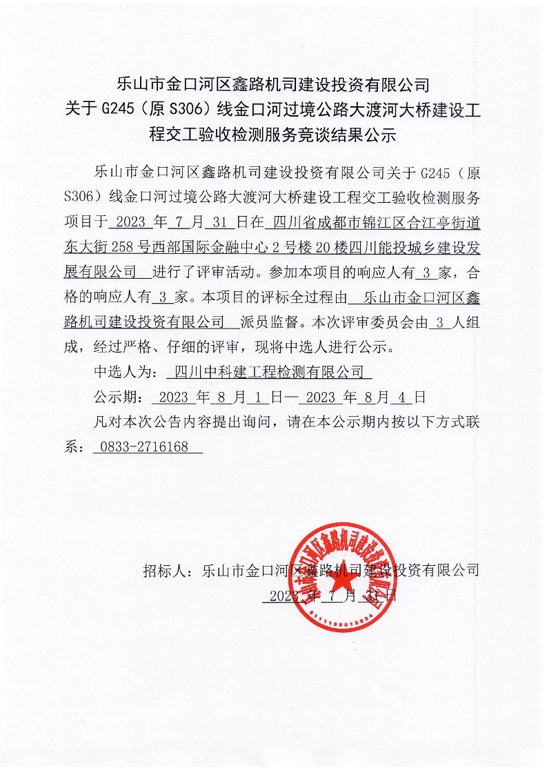 关于G245(原306)线金口河过境公路大渡河大桥建设工程交工验收检测竞谈结果公示