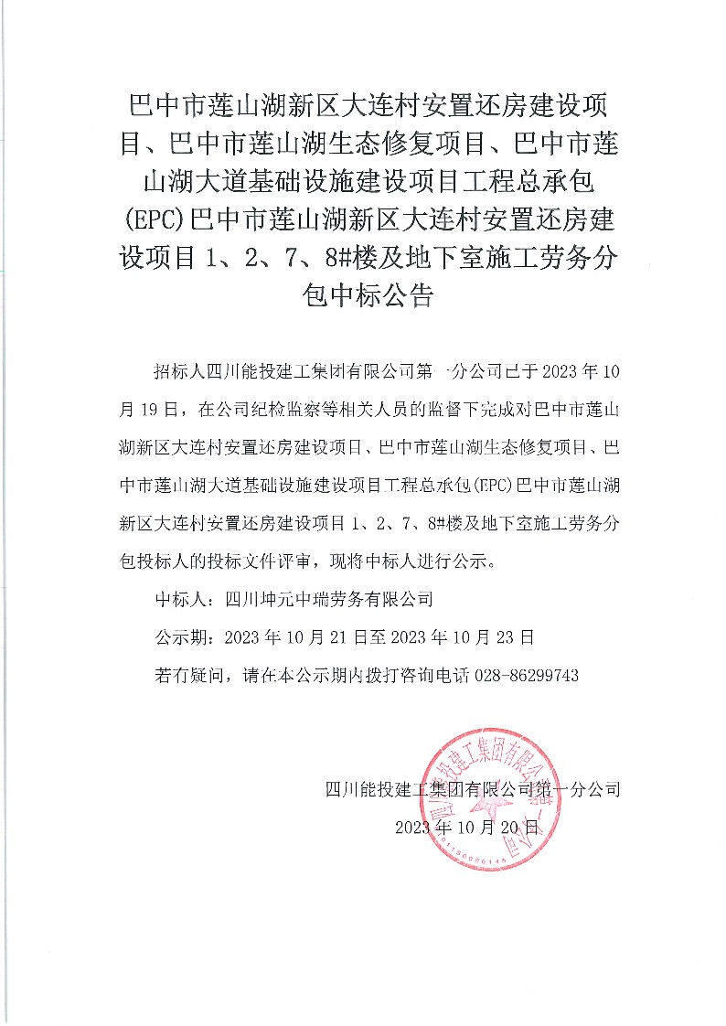 巴中市莲山湖新区大连村安置还房建设项目1、2、7、8#楼及地下室施工劳务分包中标公告