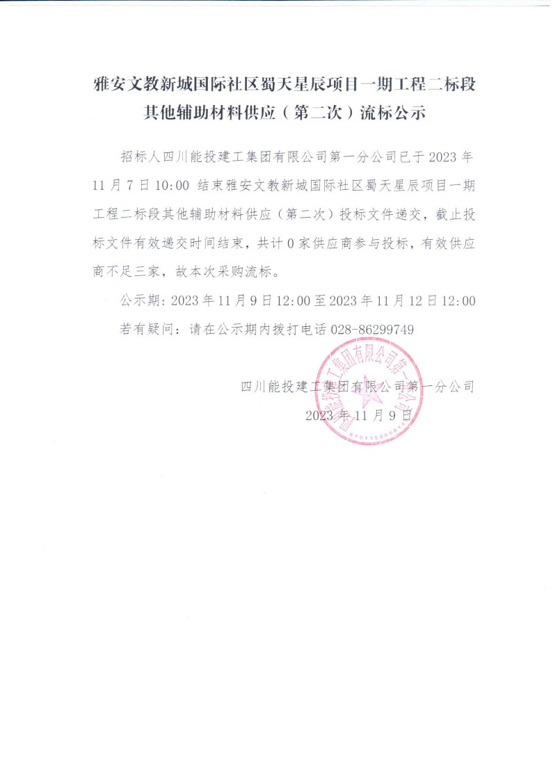 雅安文教新城国际社区蜀天星辰项目一期工程二标段其他辅助材料供应(第二次)流标公示