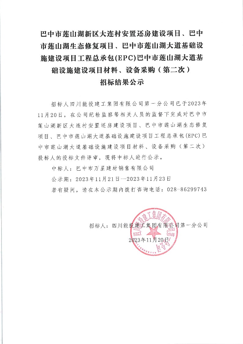 巴中市莲山湖大道基础设施建设项目材料、设备采购(第二次)结果公示