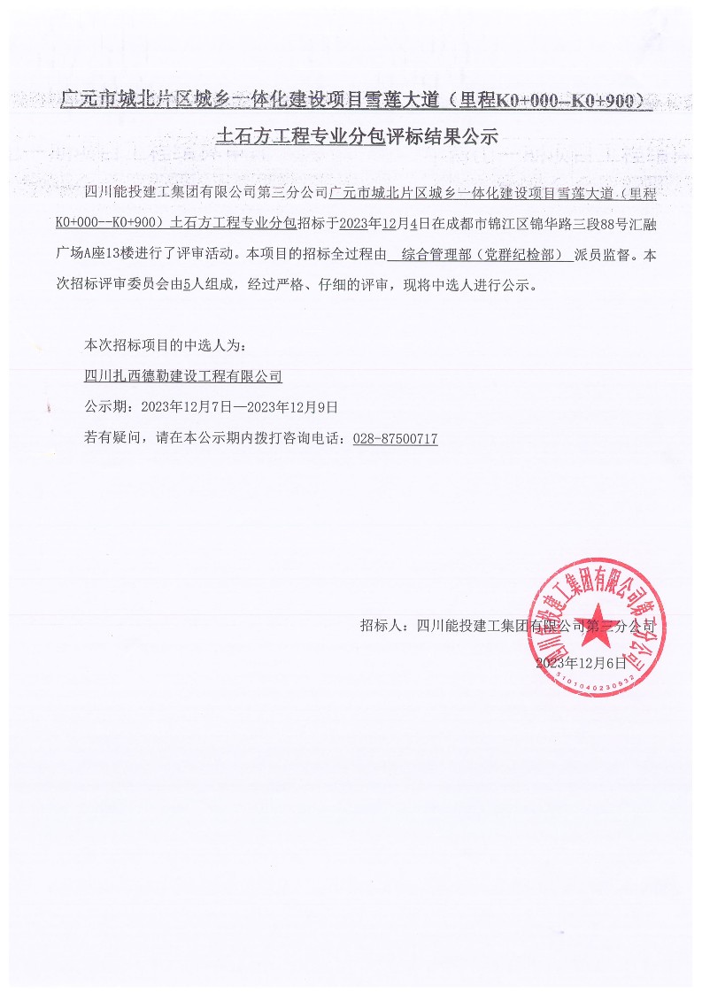 上一条:广元市城北片区城乡一体化建设项目雪莲大道(里程K0+000--K0+900)劳务分包结果公示