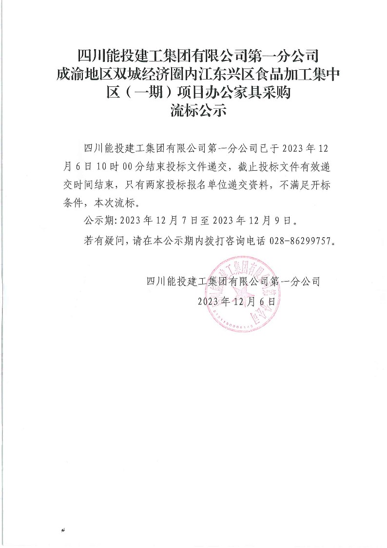 成渝地区双城经济圈内江东兴区食品加工集中区(一期)项目办公家具采购流标公示