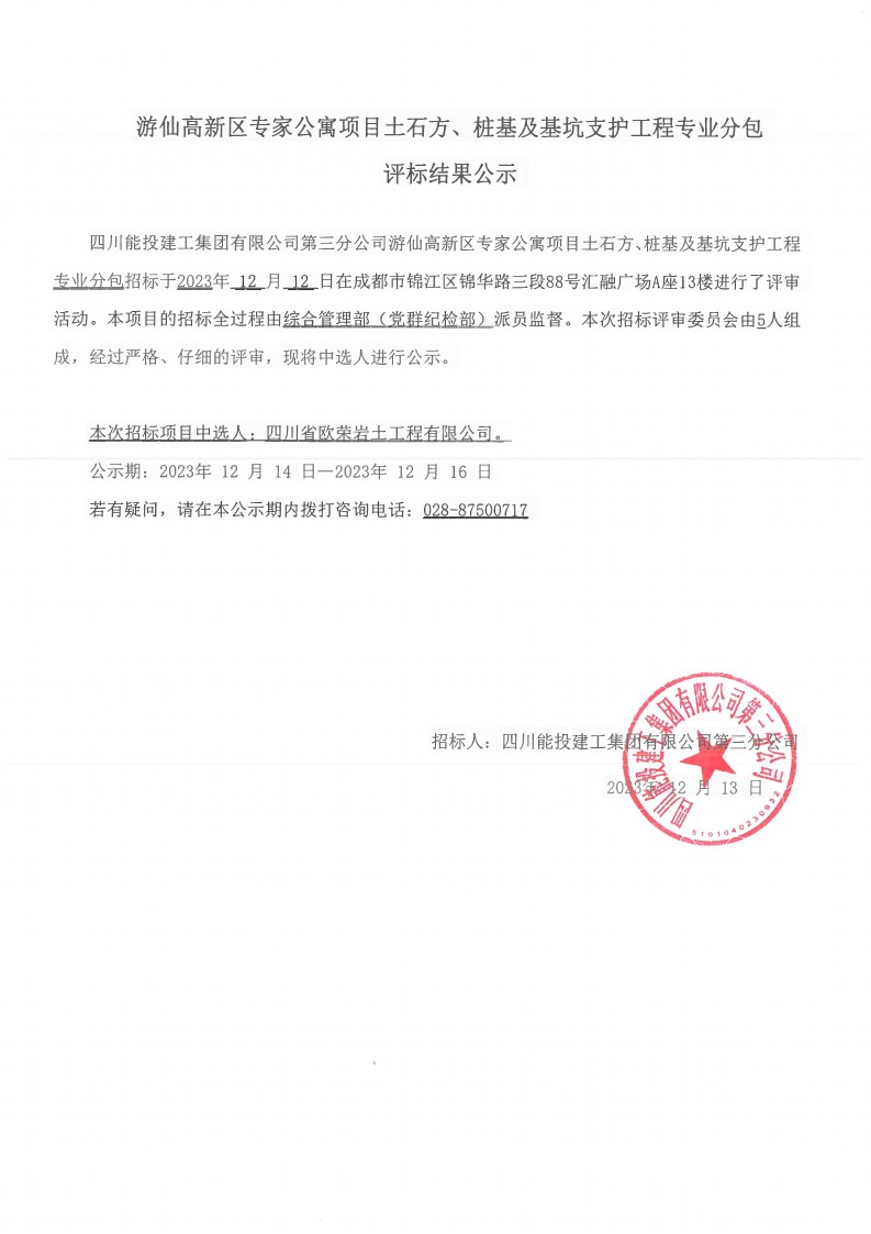 游仙高新区专家公寓项目土石方、桩基及基坑支护专业分包结果公示